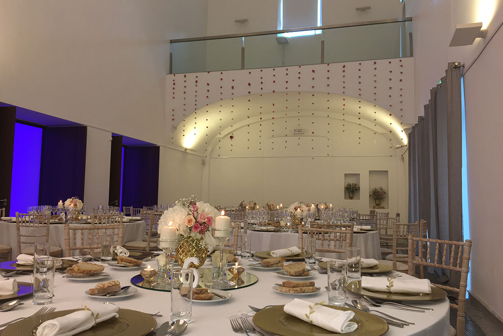 No M´AR De AR Muralhas os noivos dispõem de uma ampla e elegante sala aberta sobre os jardins e a Muralha histórica - um dos maiores espaços para eventos da cidade de Évora, com cerca de 500 m2 e capacidade para 300 pessoas sentadas - constitui um espaço privilegiado, onde os casamentos ganham outra dimensão. O Muralhas dispõe ainda de uma área verde de grandes dimensões junto da muralha e da piscina, onde os noivos poderão realizar a cerimónia civil, o cocktail ou até mesmo a realização do almoço ou jantar ao ar livre ou com tenda.